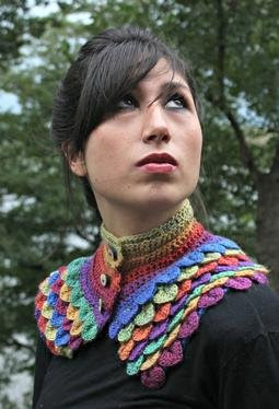 She looks like she killed a rainbow chicken and wrapped it around her neck. She does not look too happy about it.